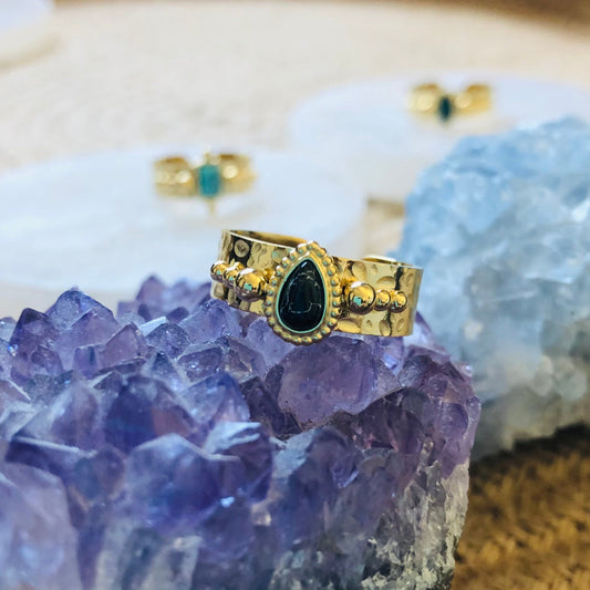 Adjustable Black Natural Stone Drop Boho Ring - Gold