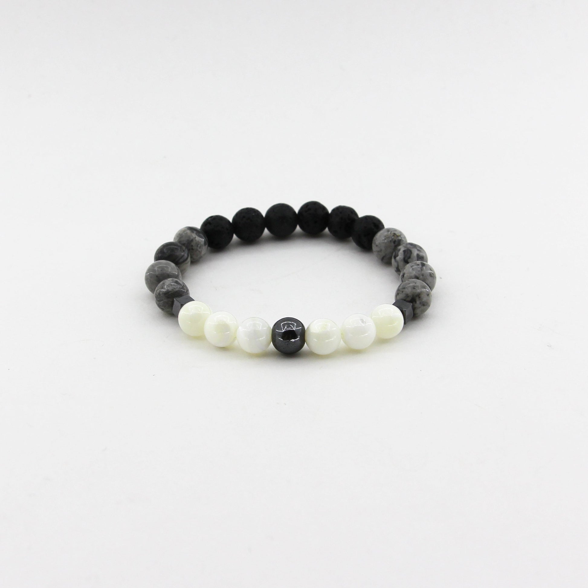 Emotional Strength - Silver Crazy Lace Jasper, Mother of Pearl, Lava, Hematite - Gemstone Bracelet